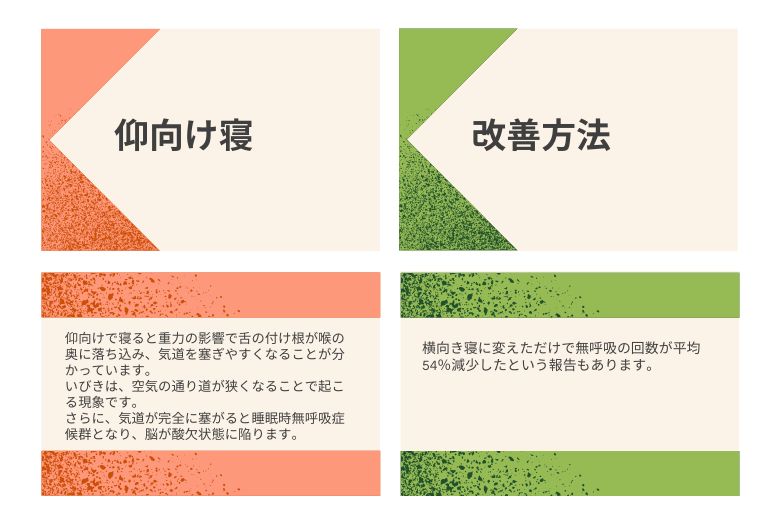 アメリカ睡眠学会の研究によると、仰向けで寝ると重力の影響で舌の付け根が喉の奥に落ち込み、気道を塞ぎやすくなることが分かっています。